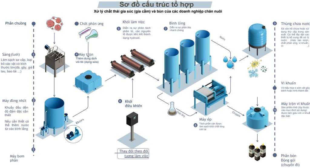 Chất thải được xử lý trong dây chuyền với lưu lượng 10m3/h. Nước thải sau khi xử lý đủ điều kiện thải ra môi trường hoặc tái sử dụng cho mục đích tưới tiêu.